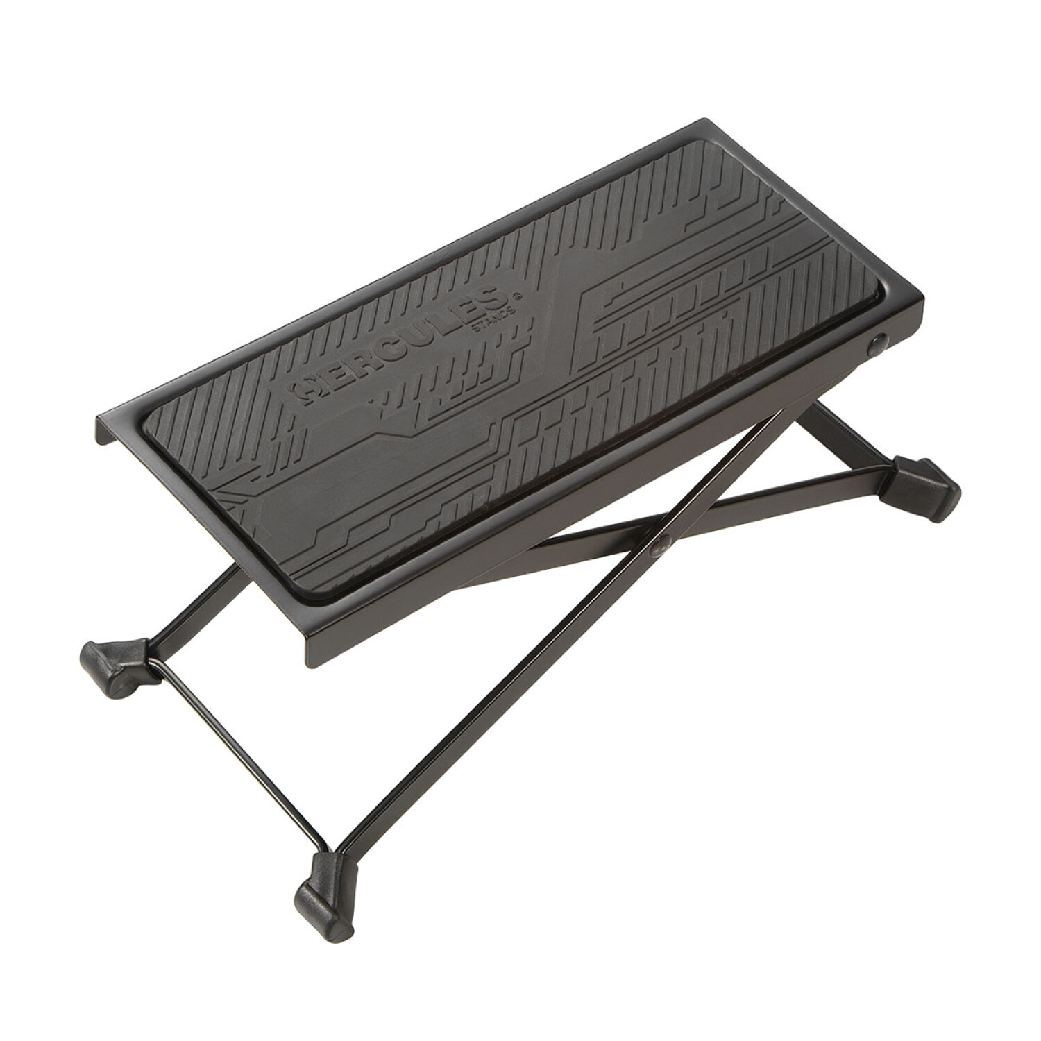 El reposapiés para guitarra HERCULES FS100B tiene una gran placa para los pies revestida con goma sólida para un soporte antideslizante.