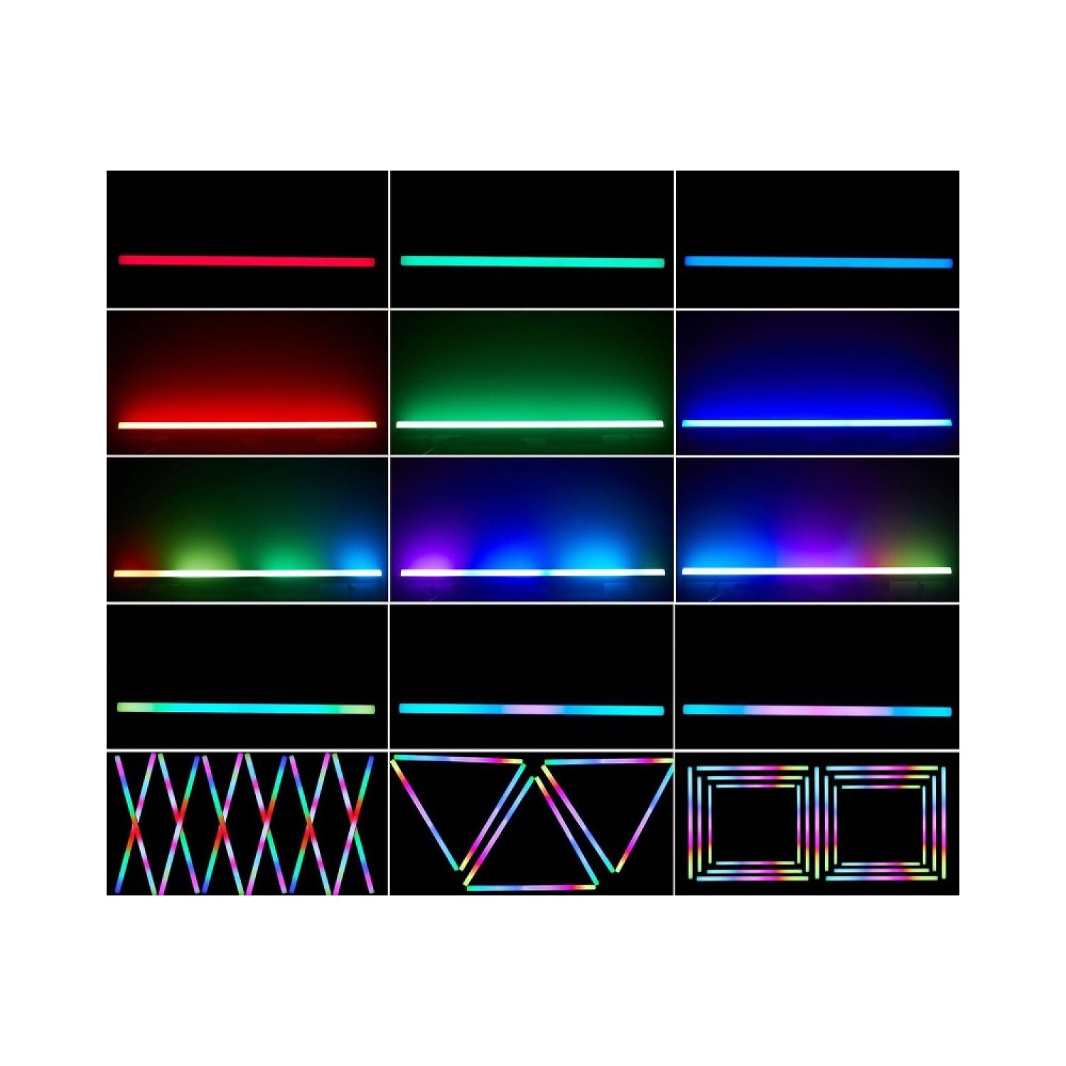 Barra de luz LED RGB con 144 LEDs SMD distribuidos en 12 segmentos, ofreciendo efectos de persecución activados por sonido y mezclas de colores vibrantes. Ideal para escenarios, DJs, bodas, iglesias y eventos.