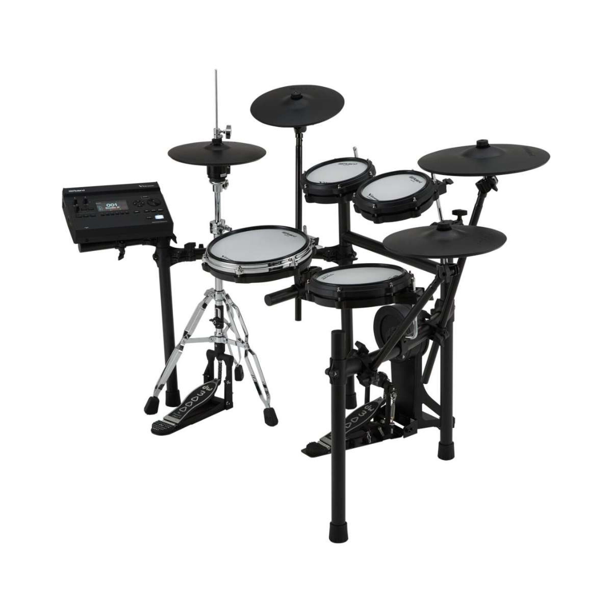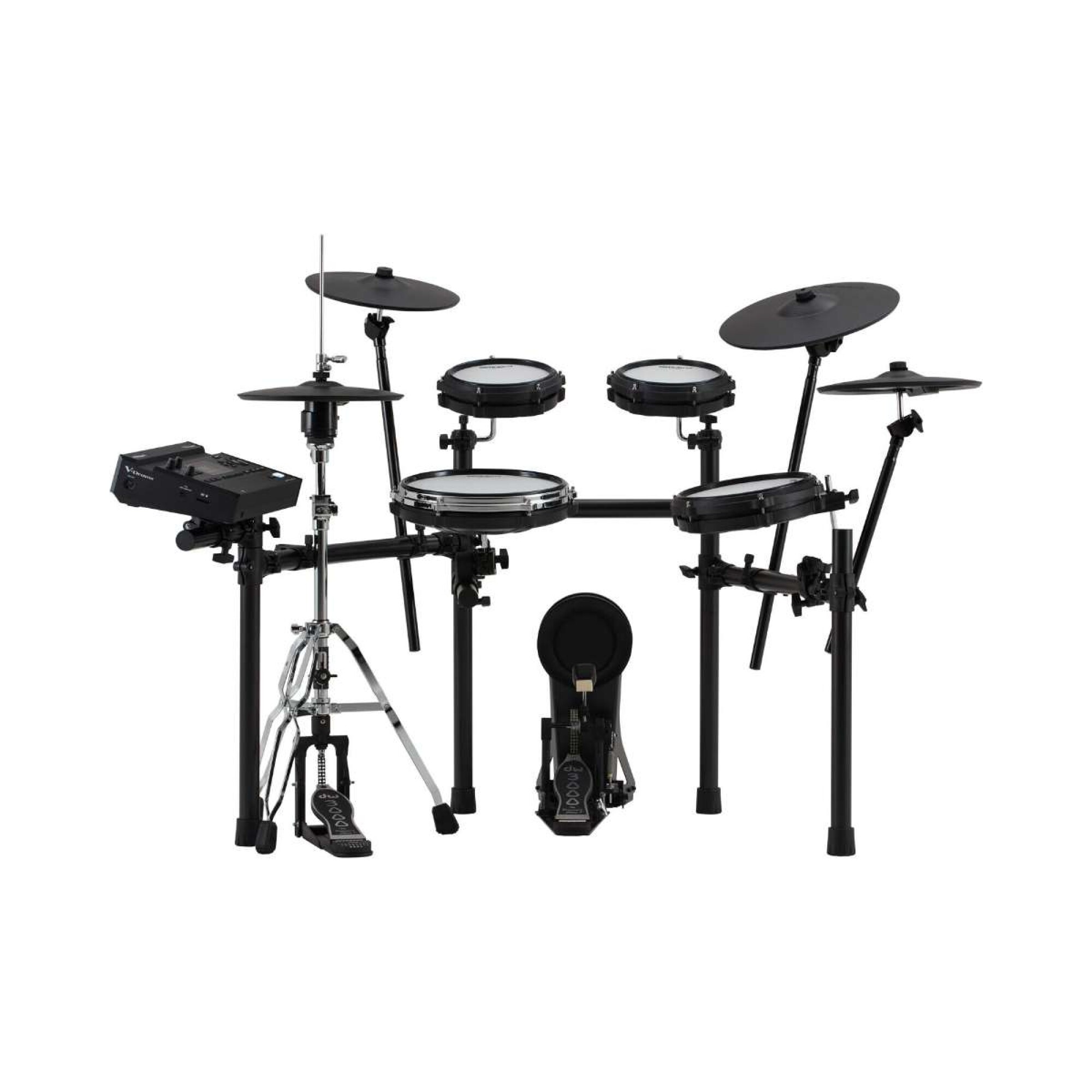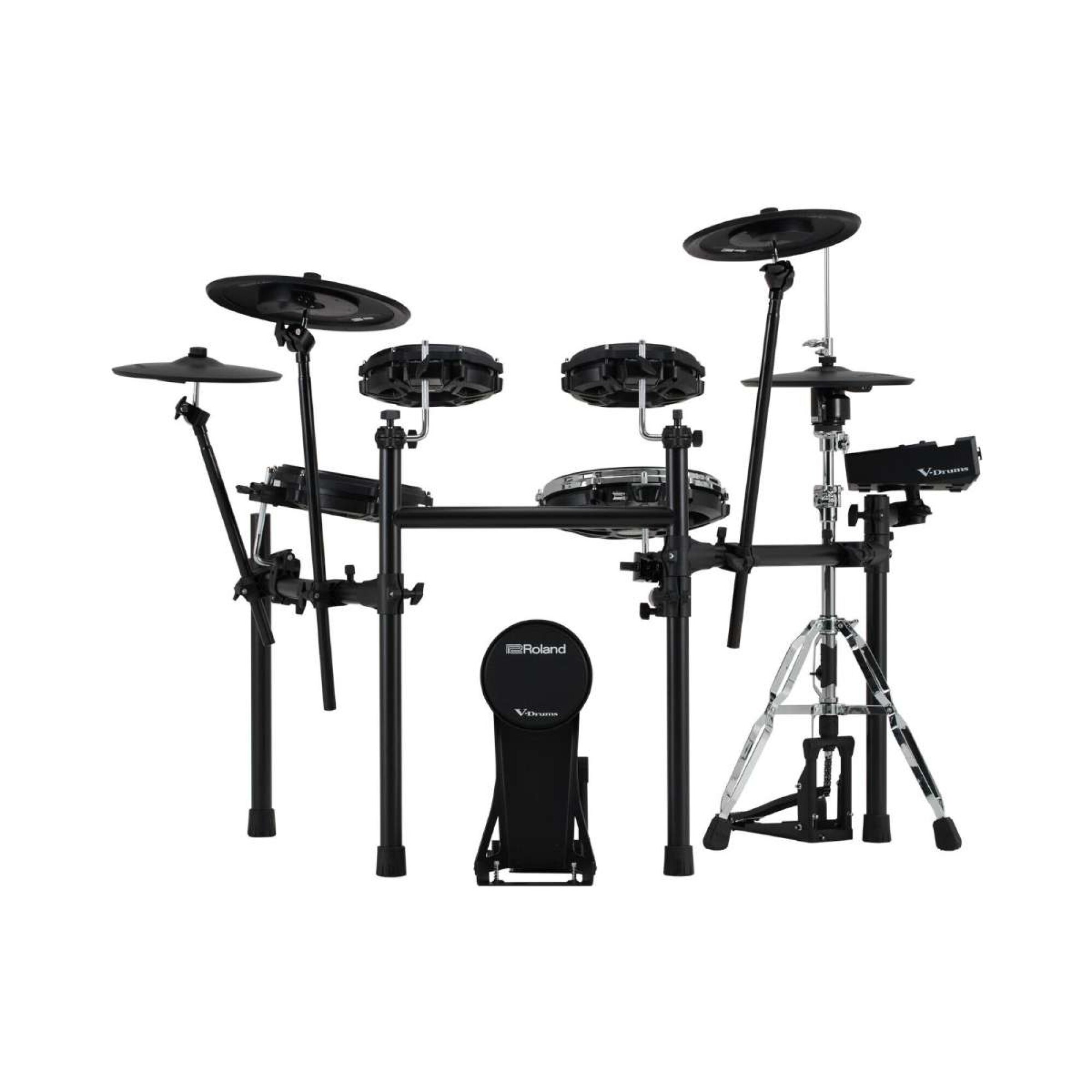 Este kit eleva el nivel con componentes mejorados y una configuración más completa: charles VH-10 montado en soporte, dos platos crash, pads optimizados y un formato compacto que no sacrifica sensaciones ni prestaciones. Además, suma conectividad inalámbrica para acceder a expansiones y contenidos desde Roland Cloud, junto con potentes herramientas de práctica para el uso diario.