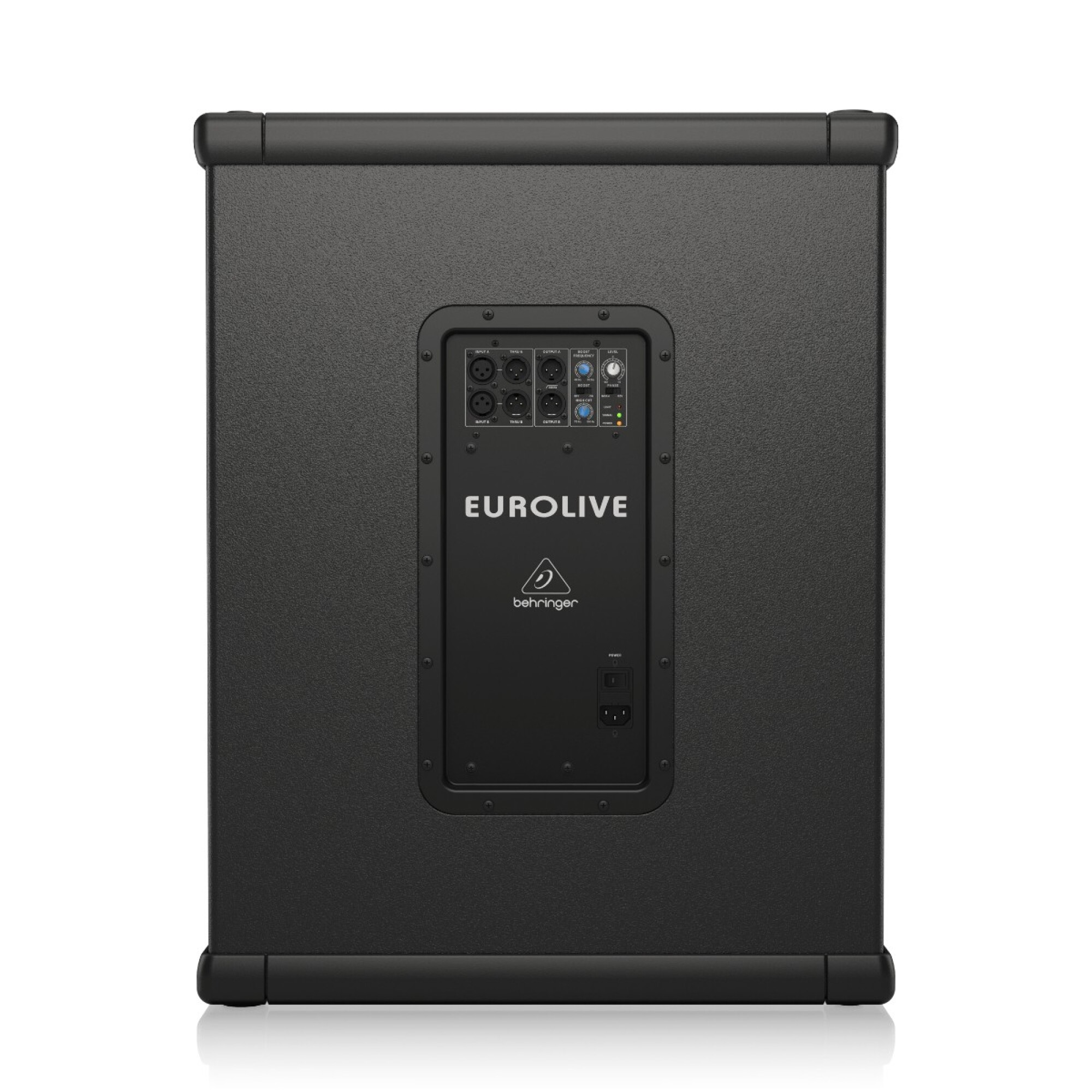 Controles: nivel (-8 a +6 dB), boost (40–90 Hz, +10 dB), fase (0°/180°), high cut (70–150 Hz)