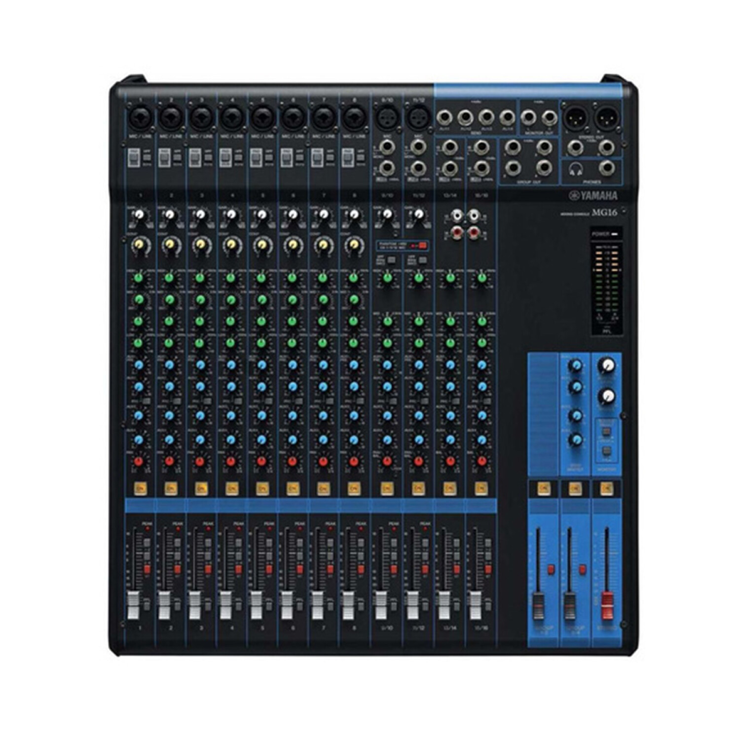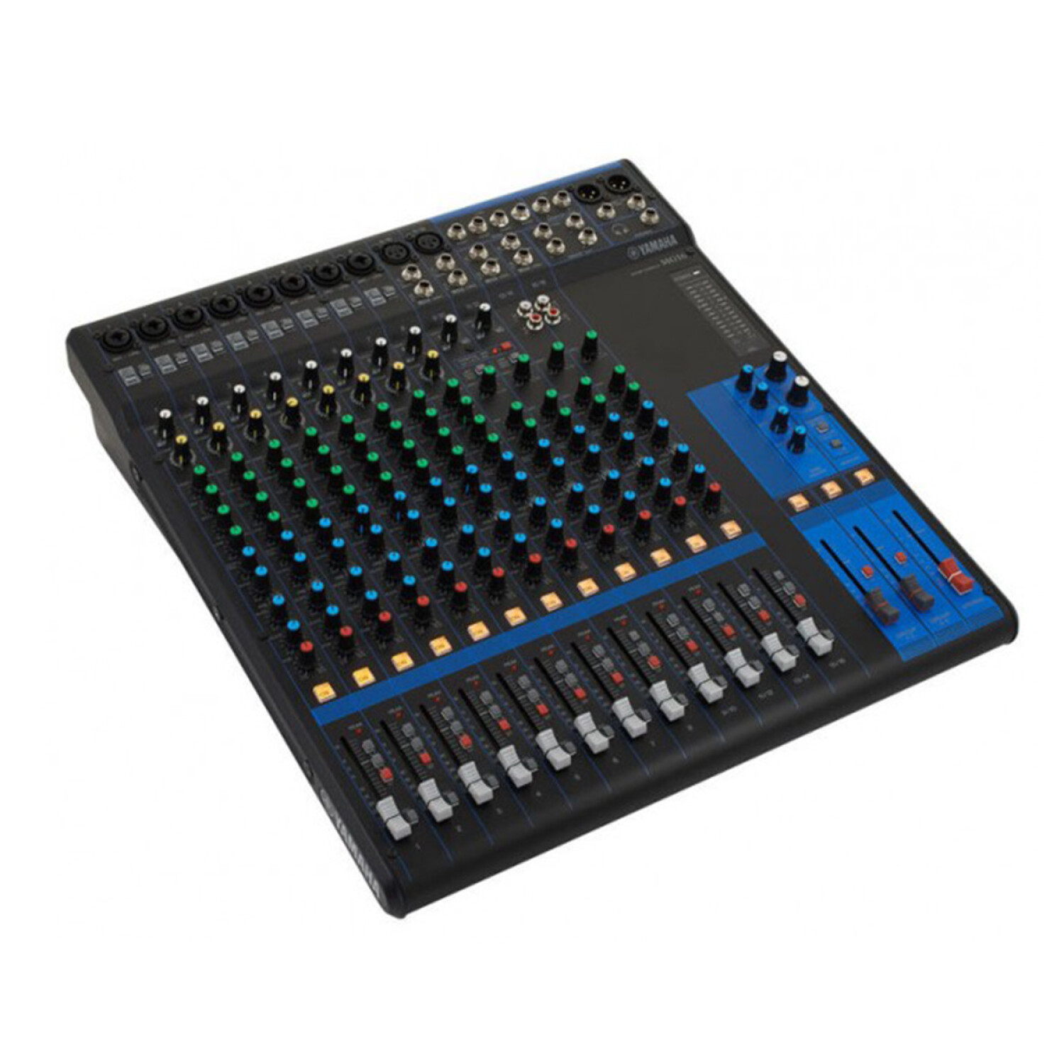 Mesa de mezclas de 16 canales: máximo 10 entradas de micro/16 de línea (8 mono + 4 estéreo); 4 buses de grupo + 1 bus estéreo; 4 envíos AUX (incluyendo envío para efectos).