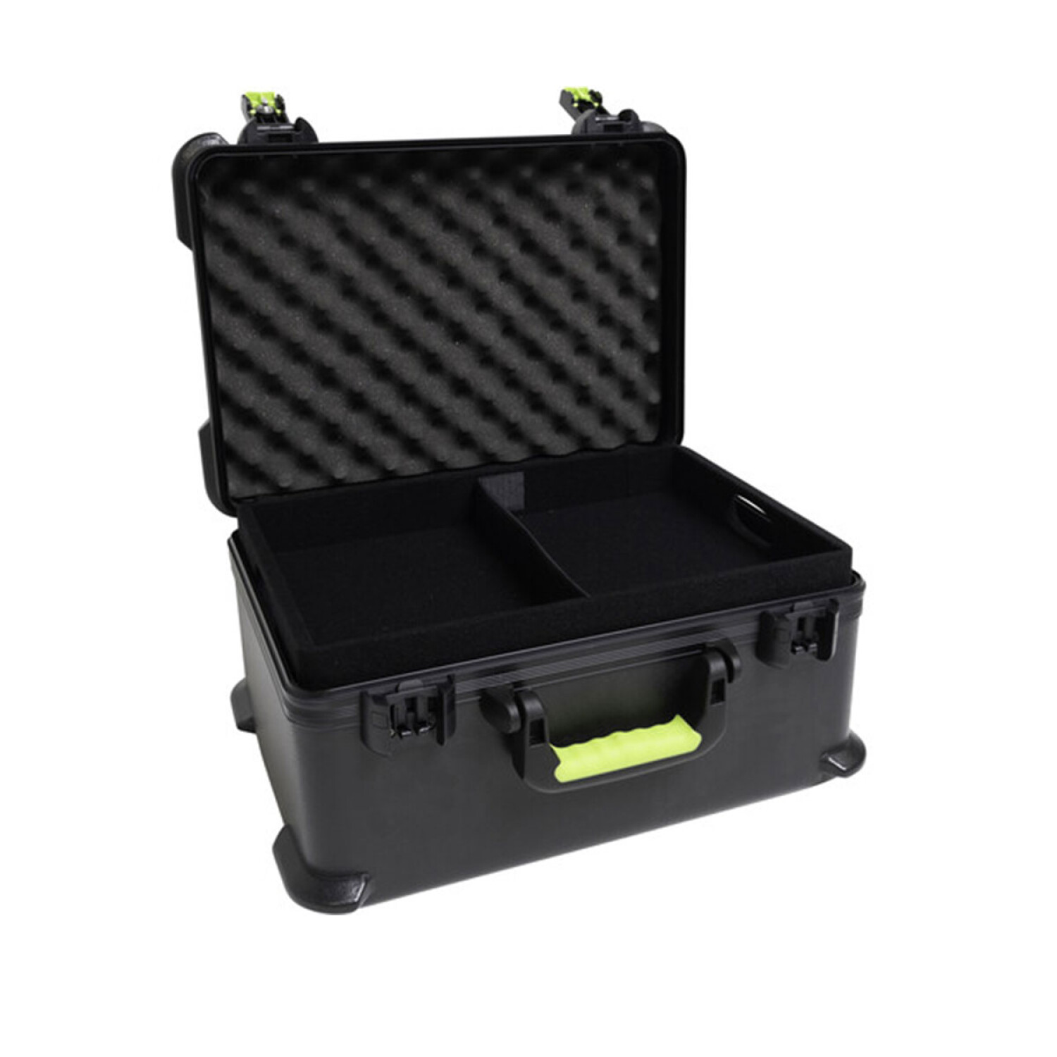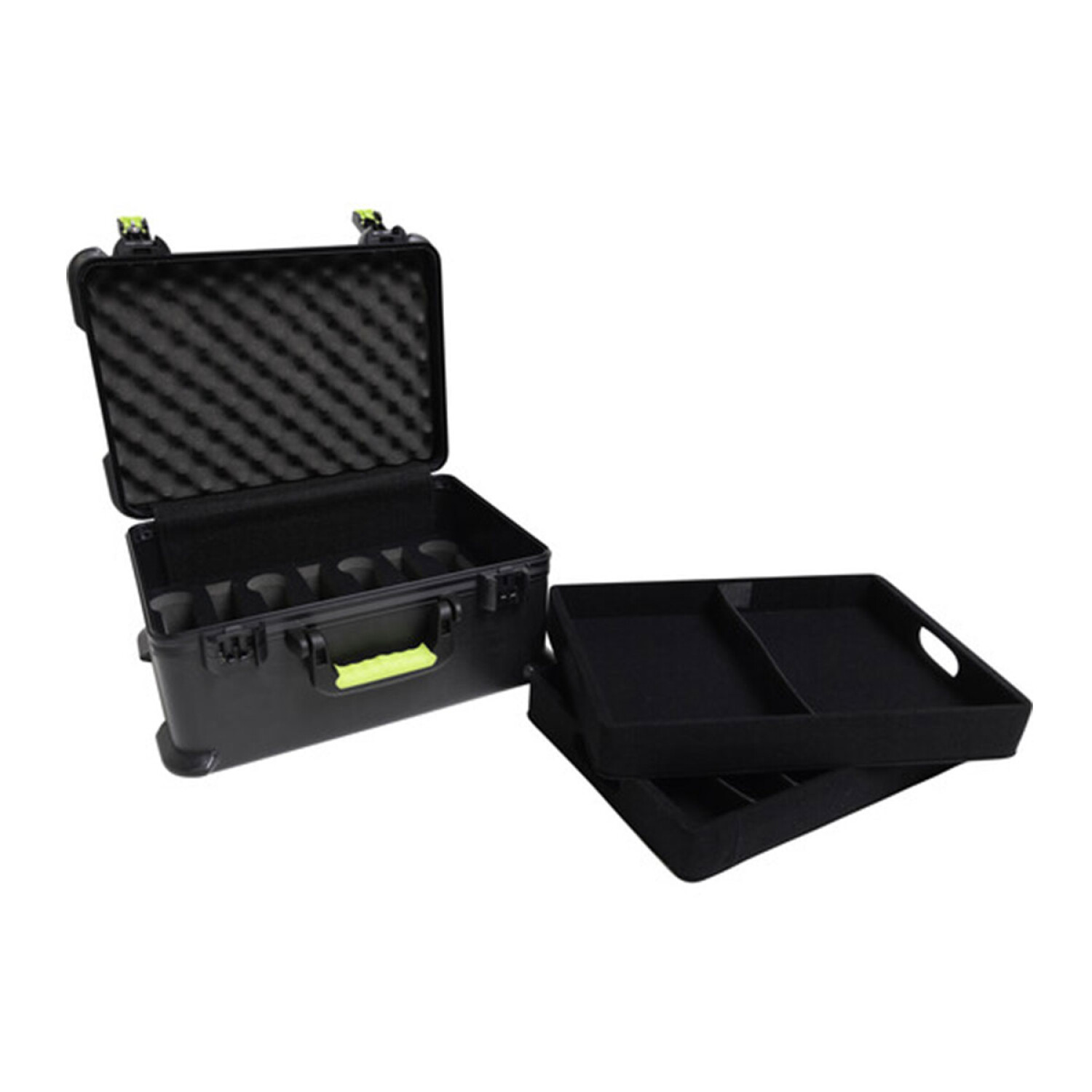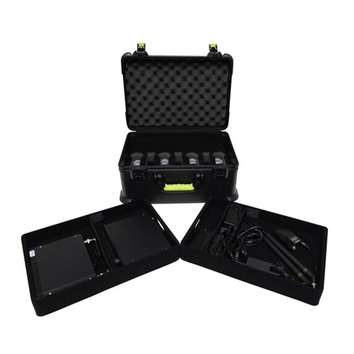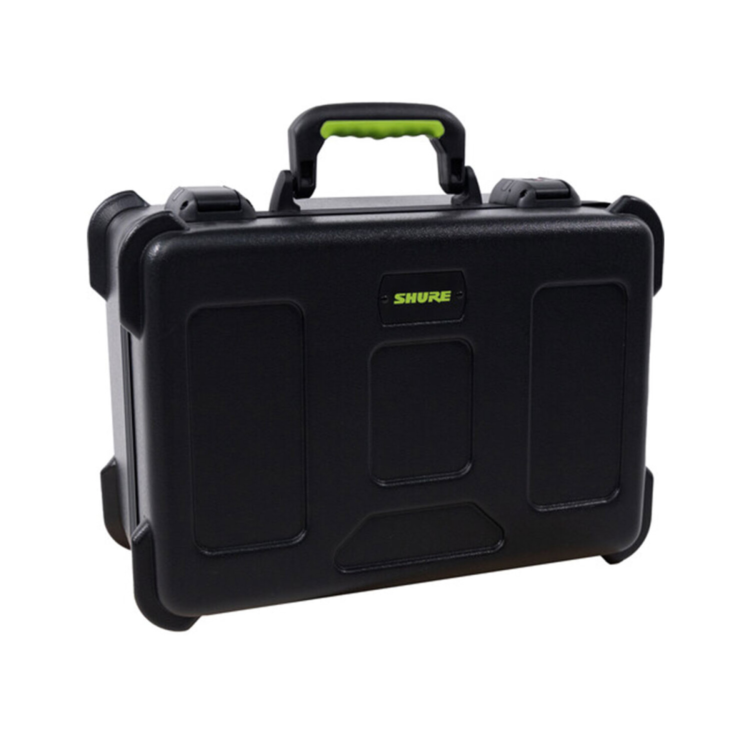 El Shure SH-MICCASEW07 es un estuche moldeado que puede contener hasta 7 micrófonos inalámbricos Shure (u otros micrófonos inalámbricos). También ofrece almacenamiento para receptores, transmisores de petaca y accesorios. El estuche está hecho de polietileno resistente y tiene pestillos de bloqueo aceptados por la TSA, lo que lo hace ideal para viajes en avión. Para proteger sus micrófonos, el SH-MICCASEW07 cuenta con bases para micrófono acolchadas con espuma. También hay 2 bandejas extraíbles con cuatro divisores ajustables. El asa ergonómica permite un transporte fácil y antideslizante.