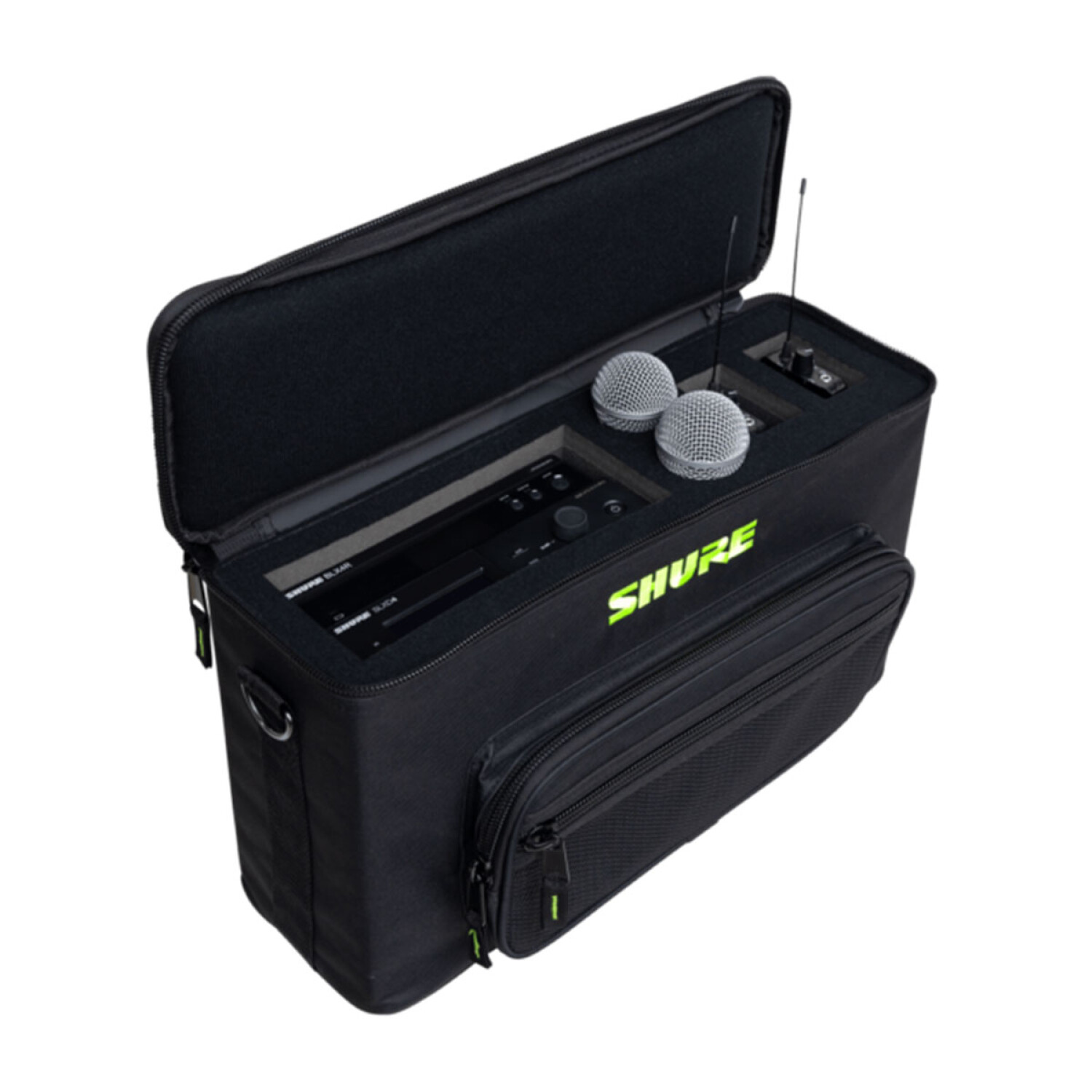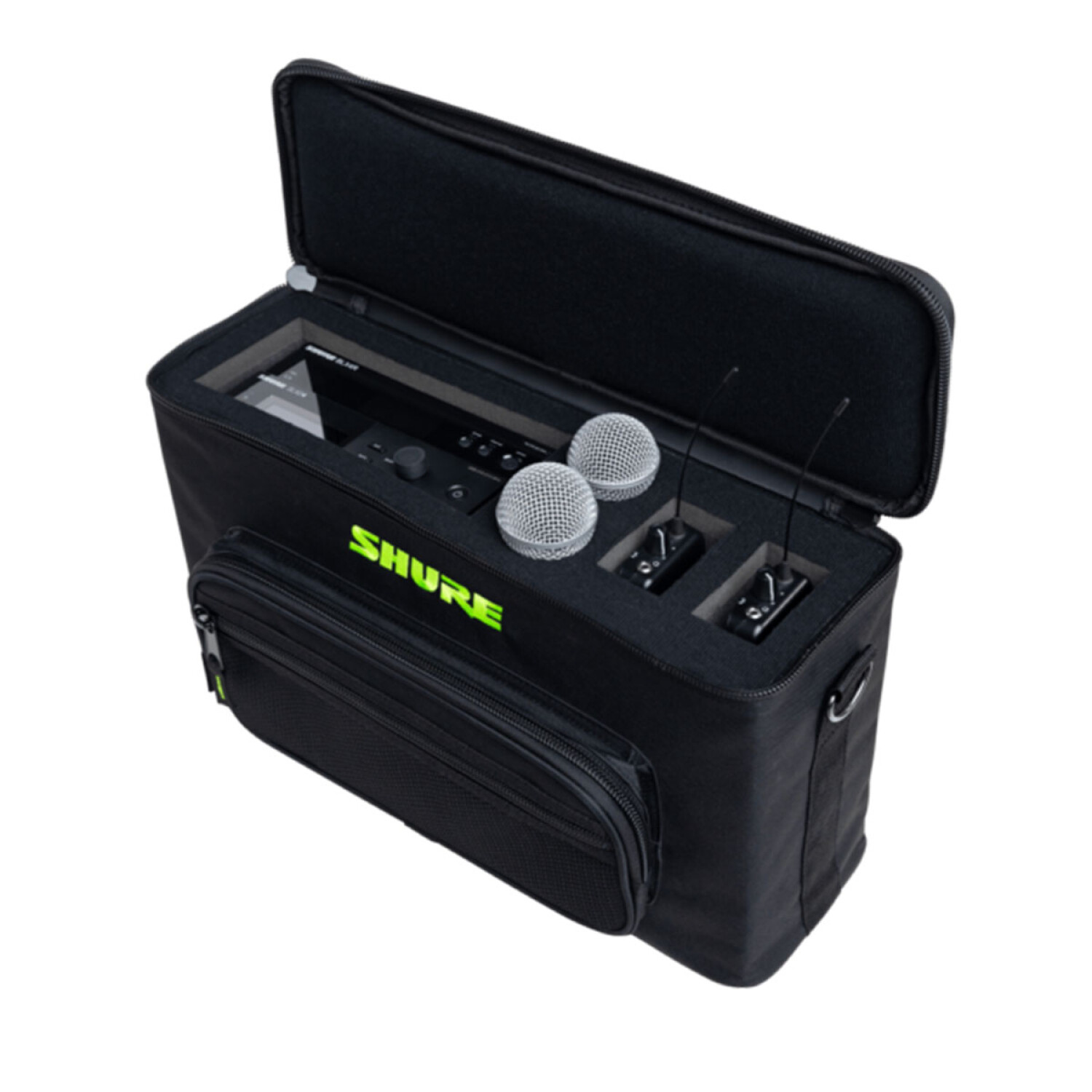 El interior moldeado tiene espacio para 2 micrófonos inalámbricos, 2 receptores y 2 transmisores.