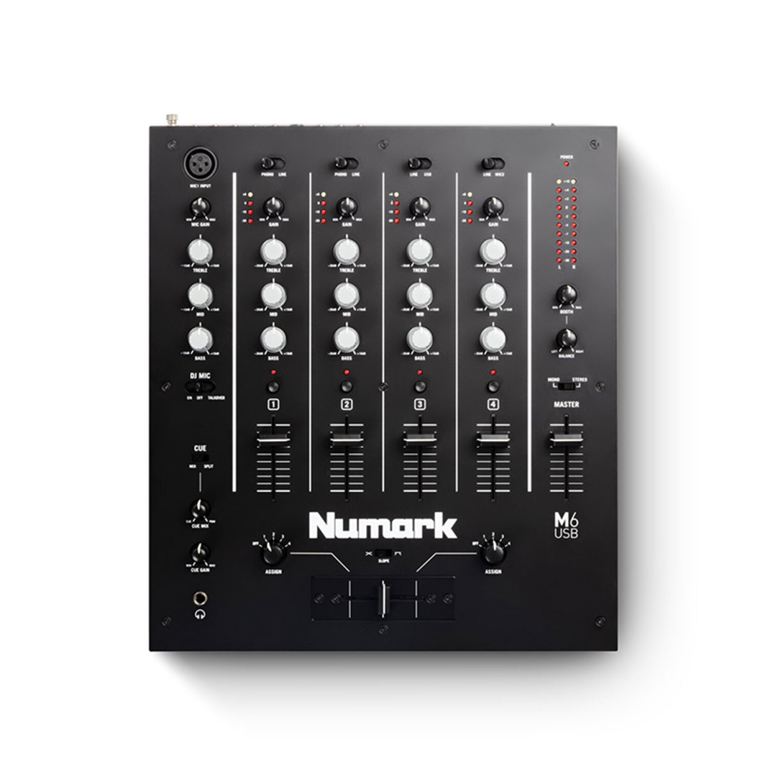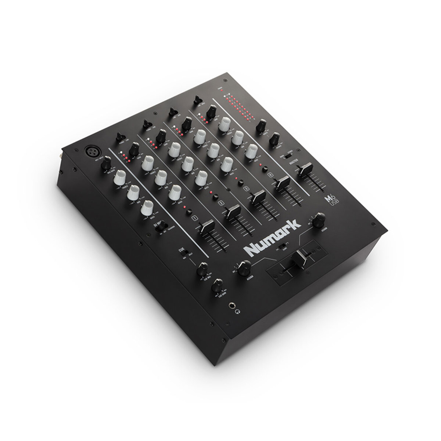 Disfrutará de una gama completa de elementos esenciales de rendimiento en M6, incluido el ecualizador de tres bandas y la medición LED por canal. M6 tiene un crossfader reemplazable con control de pendiente, y puede asignar cualquier canal a cualquier lado del crossfader.