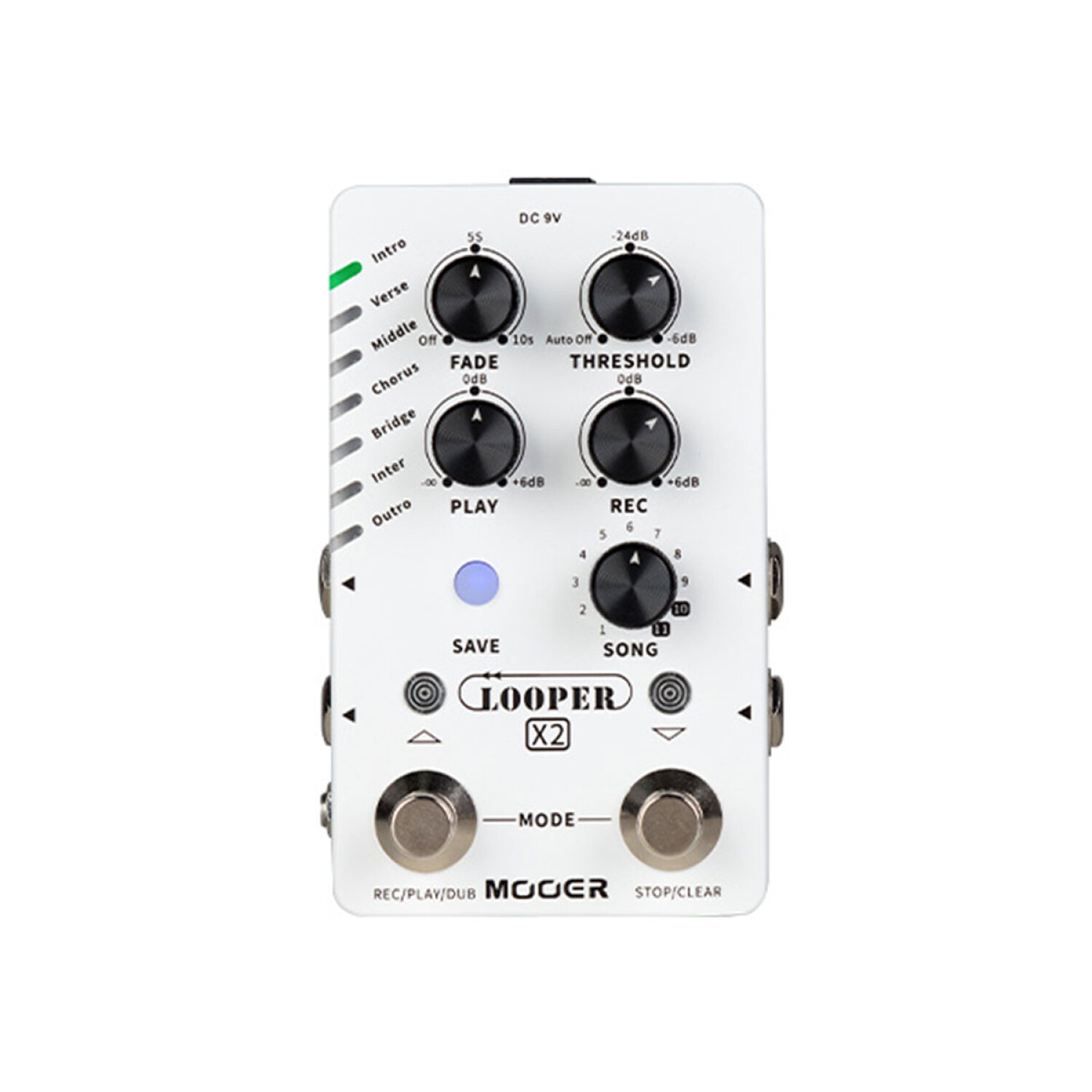 El Looper X2 es un pedal looper operado por un interruptor de pie doble que tiene como objetivo proporcionar una creación rápida de bucles sin escasez de espacio para guardar sus pistas y muestras favoritas. Con 11 bancos de canciones, cada banco con 7 ranuras para guardar, el Looper X2 ofrece un total de 300 minutos de tiempo de grabación (2,5 minutos por ranura en el banco 1-9, 10 minutos en cada banco 10, 11). Cada ranura también corresponde a estructuras de canciones comunes para facilitar la organización de secciones y pistas, como se indica en la parte frontal del pedal. Las ranuras guardadas y las pistas grabadas también se pueden administrar utilizando el software de edición especializado que se puede descargar de forma gratuita y es compatible con PC Mac y Windows.