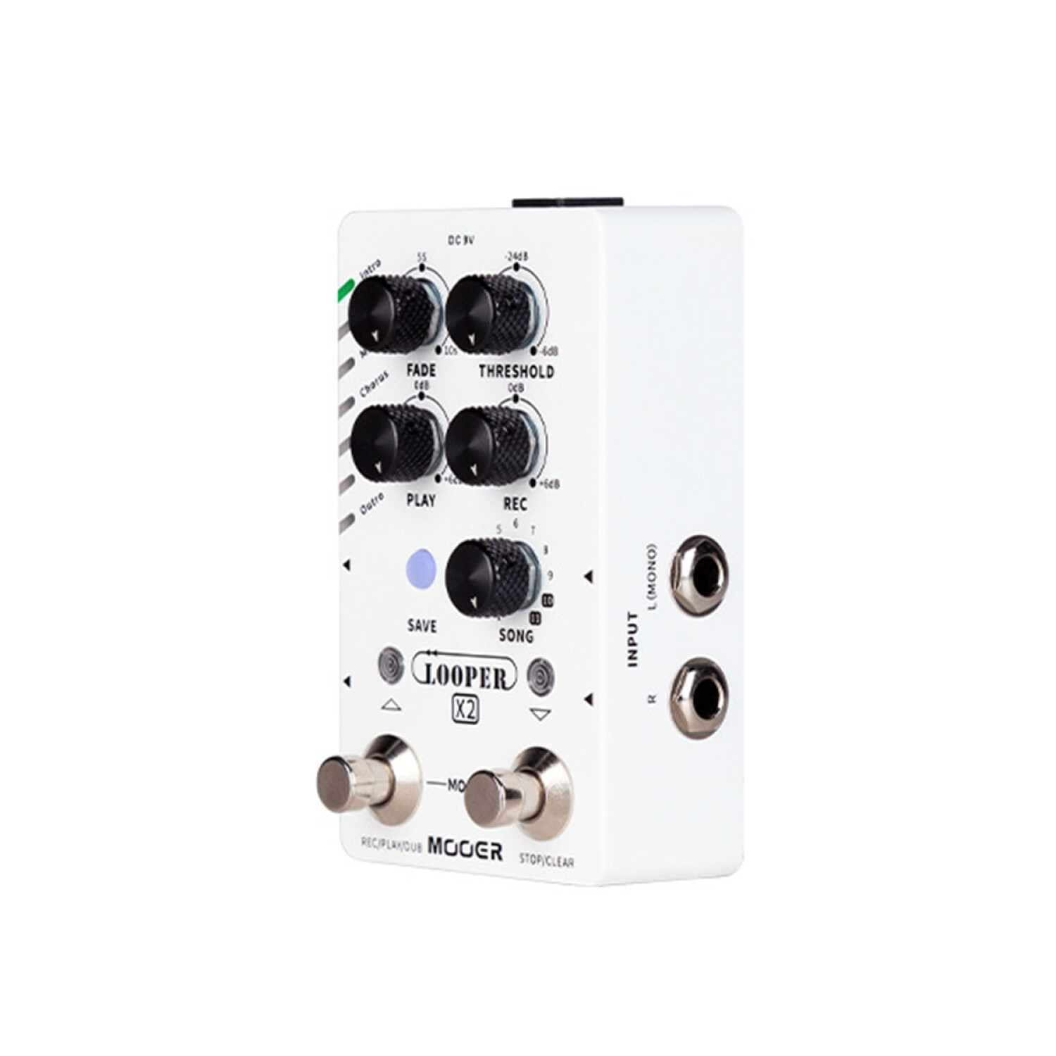 Las características adicionales del Looper X2 incluyen una perilla FADE para controlar y alternar la función Fade out para cada bucle. Los usuarios también pueden alternar una función de grabación automática para comenzar a grabar un bucle cada vez que se detecta una entrada de señal de guitarra empleando la perilla THRESHOLD. Las perillas adicionales incluyen controles de nivel de volumen separados para grabación y reproducción, así como una perilla de 11 opciones para desplazarse por los bancos de canciones. La configuración de interruptor de pie dual ofrece controles familiares de Looper y para los usuarios que desean más control, el Looper X2 también admite un interruptor de pie externo que puede realizar una variedad de operaciones como recorrer diferentes partes del banco de canciones seleccionado actualmente. Consulte el manual para obtener más información sobre la compatibilidad.