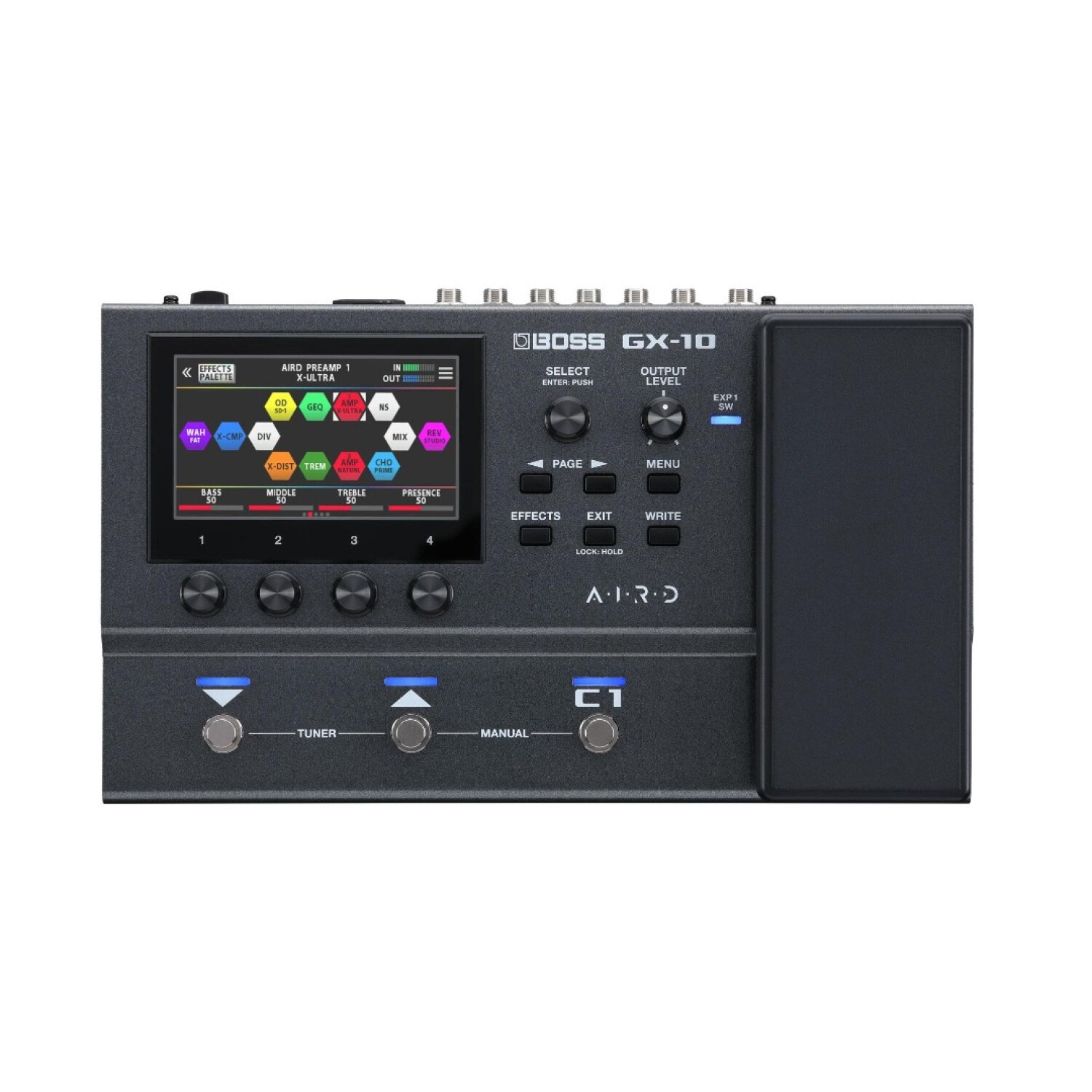32 tipos de amplificador y 170 efectos BOSS, incluyendo overdrives, distorsiones, modulaciones, delays y reverbs.