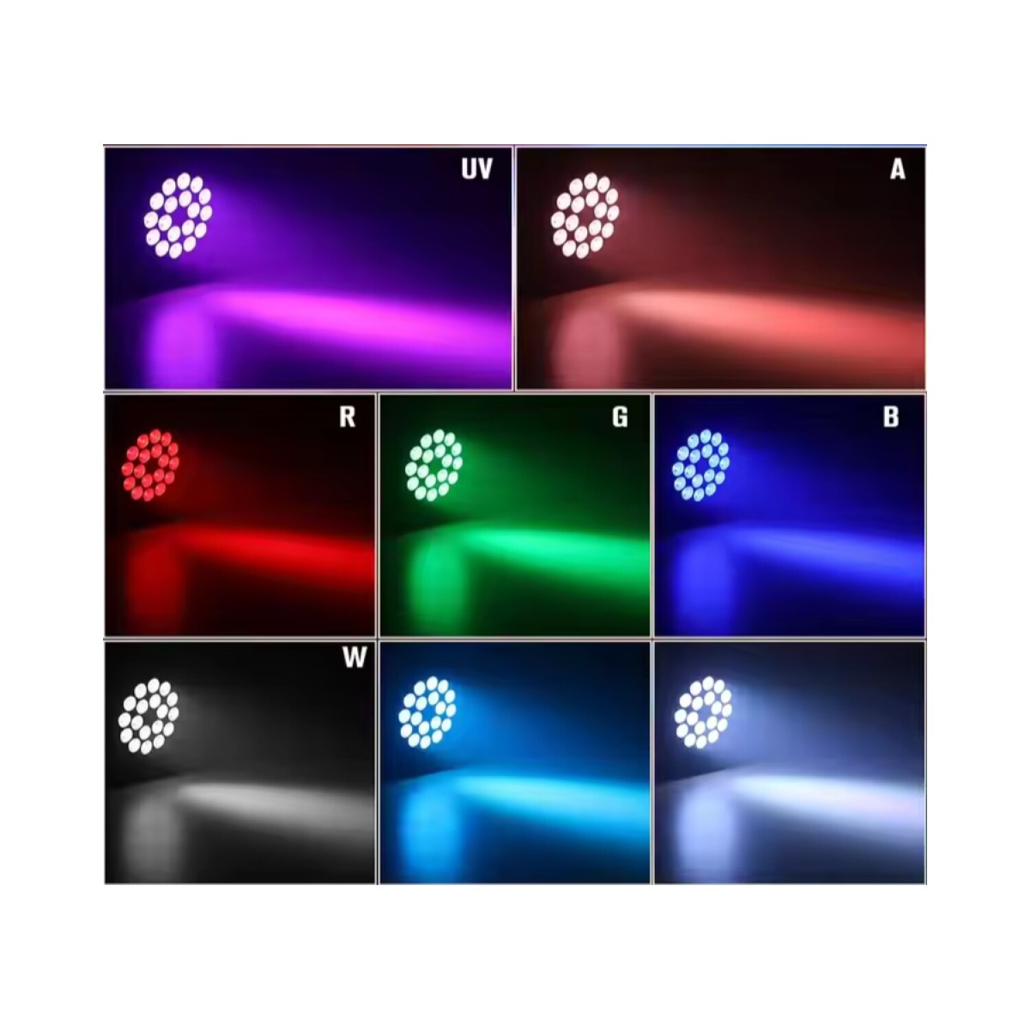 18 LEDs 6-en-1 de 18W (RGBA + Ámbar + UV)